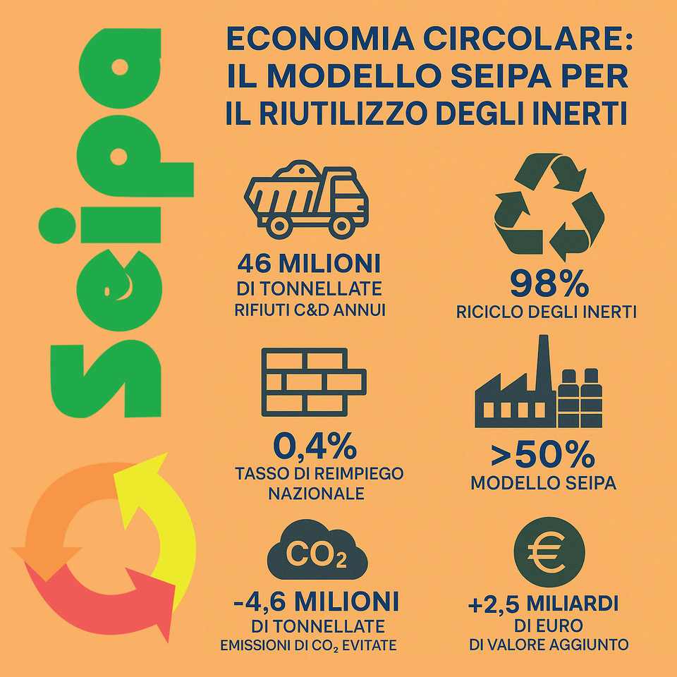 Roma, 7 ottobre 2025 – Nel settore delle costruzioni, dove il 98% dei rifiuti inerti viene già avviato a riciclo ma solo lo 0,4% viene effettivamente reimpiegato nei cantieri, il Gruppo Seipa dimostra che la transizione è possibile: nei propri impianti il tasso di sostituzione è del 52%, un risultato oltre 120 volte superiore alla media nazionale e in linea con gli obiettivi del PNRR e della Commissione Europea.